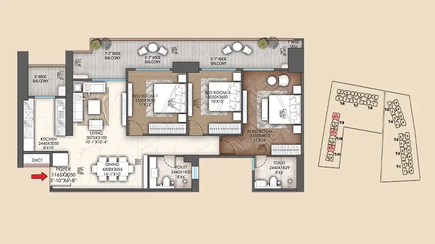 | 3 BHK + 2T - Type 1 | 1815 SQ.FT | ₹ 2.9 Cr |